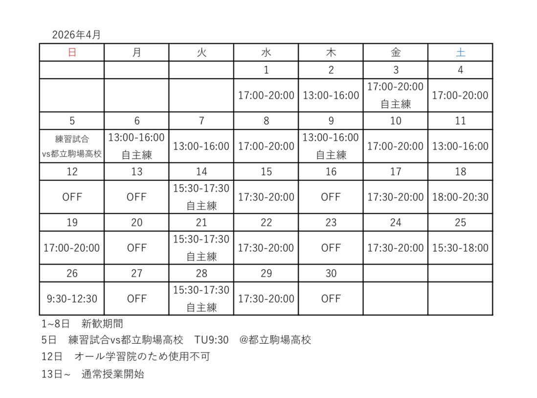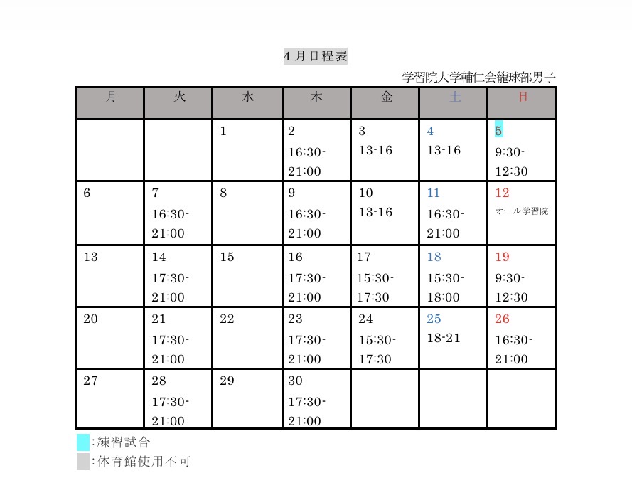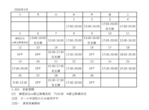 4月の日程表が決定いたしましたので、ご連絡いたします。